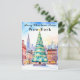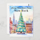 Ett festligt vykort med ett vackert dekorerat julträd i det snöiga New York, med siluetten som bakgrund. Ett julkort som säger “God jul från New York.”