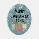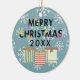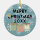 En söt prydnadsföremål av julkeramik med modern stil-typgrafi och presentboxgrafik med snöflingor-bakgrund. På framsidan står "God jul 20XX" för att du ska kunna byta önskat år och visningarna på baksidan en julkrans.