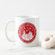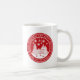 God jul Glad helg Winter Personlig Namn Coffee Tea Mugg har texten "God jul och Glad helg" i ett modernt, vitt skript på röd bakgrund och personlig med ditt namn som omger ett hem med Julgranar och snöflingor. Perfekt till julklapp party favors och Helgdag. Designad av ©Evco Studio www.zazzle.com/store/evcostudio