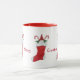 Kaffet eller teet mugg är omringat med rött och vitt julstrumpor som har söta skäggiga gnomer som kliar ut från toppen mellan två polkagrisar och grönt, som löv i grå med röda bär. Anpassa den röda God jul med mallarna.