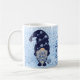 Cute blue gnomes med snöflingor och hattar på en ljusblå glittrande bakgrund.