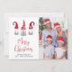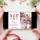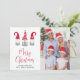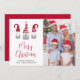 Minimal helgdag-kort med ditt foto och tre söta nordiska gnomer med rött och vitt skenbart säsong-hatt och lätt grått-tunics. "God jul" är skrivet i ett skript med trendiget red. Lägg till ditt namn i enkel modern typografi.