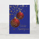 Att ge röda prydnadsföremål med guld snurrar på midnattsblå bakgrund - ett vackert julkort för dina värdefulla kunder och kunder eller dina vänner.. Och det har en hälsning på grekiska!