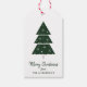 Märkrn i den här personligens presentkort har modern och söt grönt Julgran med snöflingor och snö. Gröntens skript God jul typografi på vit bakgrund. Baksidan är i fast grönt färg.