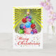 Utformningen av hälsningskort för God jul med träd gjord av prydnadsföremål, en glödande gult-stjärna och spridda stjärnor under hela designen. God jul skrivet med röd skrift grund på kortet. Anpassa eller ändra meddelandet inuti som du vill före utcheckningen. Art, bild och versell copyright © Shoaff Ballanger Studios, 2021.