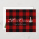 God jul hälsning på röd och svart buffelmönstrad ruta med vit julgran och klockor
