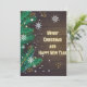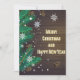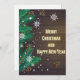 God jul hälsning på en träbakgrund med ett julträd och leksaker i amerikansk stil