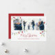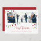 Den här designen har en snygg Jul-helgdag ljus, ett enkelt familjefoto från god jul, en klassisk färgstark röd typografi, 3 trendig med tre bilder i snyggten, ett modernt trendig i elegant, minimalistisk träd-dekoration-trimning, ett modernt calligrafskript, en liten julsträng av ljus, teckningar av laura Lacina, ett roligt-fotokort i helgdag