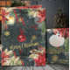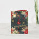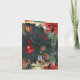Ett lyxigt vinterkort för julafton med en mörk grönt vinterbakgrund för skogen med helgdag, guld snöflingor, vattenfärgade poinsettias, gräs-kranar, röda bär med varma tända lanternor och en strålande röd boll-ornament på rött band som faller mitt i luft och God jul och som är skrivet i guld penseldraget. Hälsningen "Feliz Navidad, Joyeux Noel, Glad helg" kan användas i stället för God jul och de kan nås i designpanelen.