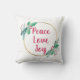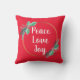 Lägg till lite glädje till din juldekoration med den här enkla moderna utformningen av en andedräkt som är gjord av guld-band och två sprickor. Inuti andemeningen skrivs helgdag "Fred, Kärlek och Joy" i contemporaryns typografi. Denna kudde är reversibel, den ena sidan är vit med rött skript och den andra sidan är röd med vitt skript.