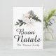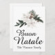 Det här julkortet har ett italienskt jultema med akvarellblommor. Frasen Buon Natale, som betyder "God Jul" i Italien, är tryckt i ett elegant skrivstilts-teckensnitt längst ner. En vinterblomsterbukett av vita julstjärnor, tallgrenar, en tallkotte och vinterlöv visas ovanför hälsningen Buon Natale. Ett exempel på efternamn är tryckt längst ner, som du kan anpassa med eget namn eller annan text. Baksidan av kortet har en sentimental julhälsning som du kan ersätta med din egen.