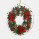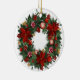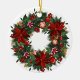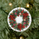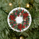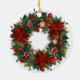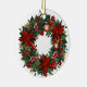 En digital illustration av en julprydnad med utandningsdesign. Utandningen består av grönt gräs grenar, röda poinsetter, röda bär, gyllene bär och röda och vita stripade kaniner. Ornamenten är rund och vit, med en guld-sträng överst för hängning. Bakgrunden är vit. Stil påminner om klassisk Juldekorationer, med en modern digital konst. Paletten i färg domineras av , gröntar och golder som skapar en festlig och varm atmosfär.