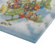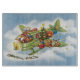 Vintagen illustrerar God jul helgdag och transport-konstruktionen med ett gult Jultomten som flyger ett gammaldags propellerflygplan i himlar med älvar, leksaker, dockor, inslagna presenter och Julgran på vinge. De flyger det antika flygplan genom de fluffiga vita molnen och stjärnorna i blå himmel över en söt, quaint by och skog med träd täckt i snö under vintersäsongen.