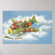 Vintagen illustrerar God jul helgdag och transport-konstruktionen med ett gult Jultomten som flyger ett gammaldags propellerflygplan i himlar med älvar, leksaker, dockor, inslagna presenter och Julgran på vinge. De flyger det antika flygplan genom de fluffiga vita molnen och stjärnorna i blå himmel över en söt, quaint by och skog med träd täckt i snö under vintersäsongen.
