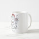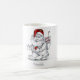 En vit keramisk mugg med en jultemad illustration. I illustrationen visas en visuell bild av Jultomten, som återges i ett skiss-liknande stil med bra linjer och skuggning. Tomten visas i en promenad och bär sin traditionella röda hatt med grönt holly löv, ett vitt skägg och ett vitt kostym med röda accenter. Han håller ett rött äpple i ena handen och en påse fylld med candy cane och en gåva inslagen i rött och vitt i den andra. Ord "God jul och Gott nytt år!" är skrivet i ett elegant vid grund i mugg. Bakgrunden är vit, vilket gör att bilden blir tydlig. Stil i illustrationen påminner om veteranjulskorten, med fokus på detaljrikedom och en lekfull, festlig anda.