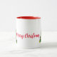 Njut av kaffet, äggdonet eller kakan i en söt mugg i toppen som har frasen " God jul " med rött typsnitt, mitt i två färgstarka Julgranar mot en vit bakgrund. Det finns alternativ för att hantera färg. Bild efter Buttercys Clothing and Collecables.