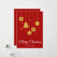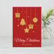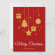 God jul i ett finare-kalligrafteckensnitt med hängande Julgran, presenter, stjärna och julklapp. Den röda bakgrunden till julkortet färg är designad så att du kan byta färg i bakgrunden och även ange namn i familjen eller ta bort det om du bara vill ha designen utan efternamnslinjen.