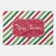 God jul illustration med text och snöflingor på röd, vit och grönt strimlad bakgrund