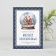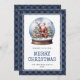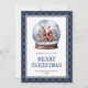 Anpassningsbar blå buffelhäst med julkort med en snö-glob med Jultomten och renar. Anpassa enkelt det här blåa julkortet med din familj namn och året.