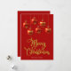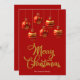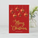 God jul i ett finare-dekorativt skripttypsnitt i guldfärg med rött och guld-toner som hänger på utformningen av julbalkar. Den röda bakgrunden till julkortet färg är designad så att du kan byta färg i bakgrunden och även ange namn i familjen eller ta bort det om du bara vill ha designen utan texten.