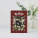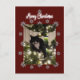 Julkort med min Tuxie-katt på träd. Burgundisk bakgrund. God Jul.