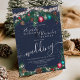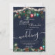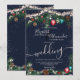 Ett modernt, chic och elegant bröllop julafton ljus grönt grenar snö med söt illustration av glitter julprydnad, gräs boll grönt, mistletoe, gräs koner, grenar gräs på redbar marin blå bakgrund.