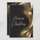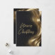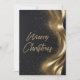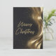 En lyxjulformgivning med en abstrakt metallisk guld-önskning med fläckar av guld glitter och guld "God jul" på svart bakgrund. Anpassa ditt meddelande på baksidan.