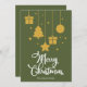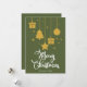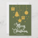 God jul i ett finare-dekorativt skriptteckensnitt med hängande julikoner och presenter-design. Den här mörken är det oliv grönt färg-julkortet designat så att du kan byta färg på bakgrunden och även ange namn i familjen eller ta bort det om du bara vill ha designen utan texten.