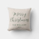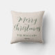 Säsong-kuddedesignen har en modern elegant-skriptgrönt "God jul", med gräddbeige bakgrund och anpassningsbar som kan vara personlig med ditt efternamn.