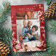 Modern fotokort för den orustiska familjen God jul med säsong vattenfärgad burgundi och rosa botaniskt skogblad och blomkrans och en renare med röd bakgrund. ++++++++++ På baksidan har kortet en mörk röd vintage med vattenfärgbakgrund, en blommigt bukett och ett blanksteg för handskriven text/namnteckning.