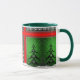Julvinter träd med två tonlägen röd kor-dekorativ gräns och svart silhuetttatuering mot stil träd.