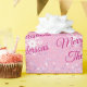 Anpassa namn och God jul, eller meddelande, i Fuchsia-skript text på ljus rosa bakgrund med glitter och snöflingor; perfekt för att slå in den speciella gåvan. Klicka på Redigera design om du vill ändra färg och skriva stilar.