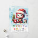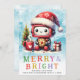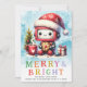 Det här unika Helgdag har ett "Merry and Bright" som säger designat i färgfull typografi och en söt robot som bär en tomtehatt som är sitta nära Julgran, en presentlåda, ett kopp av hett kakao och som håller en cookie. Denna festliga illustration är på blå botten tillsammans med snöflingor. Det är ett julkort som gör det enkelt att anpassa sig till hälsning, Familj namn och år.