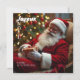 Rolig julkort i fyrkantigt format med sovande tomte som håller en present att dela ut i händerna. Vit samtida text "God Jul", plus en liten fras, alla texter är anpassningsbara.