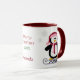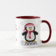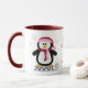 Den här söta mugg har en bra pingvin och din egen personlig. Penguin är klädd i en röd och rosa sjalv och hatt och är på väg mot en sled. Några snöflingor går ner. Bilden upprepas två gånger, med tre fält för anpassningsbarna mellan. Perfekt för stora och små barn under julsäsongen!