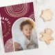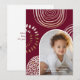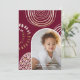 Det här vackra julkortet har ett dynamiskt burgundöst rött tryck med cirkelgeometriska former och ett modernt bågformat foto. Baksidan innehåller ett redigerbart personligt meddelande på en vit bakgrund.