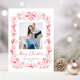 Elegant-helgdag-kort med ditt foto i en röd chinoiseriinspirerad vintage ram, med säsong greenery, klockor, bows, polkagrisar, stjärnor och poinsettia-blommigtar, "God jul" i ett rödskript för snyggt, och din familj namn och året i klassisk serif-typografi.