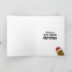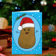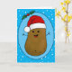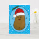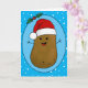 Bedårande rolig söt lycklig brun seriefigurspotatis som bär en röd och vit tomtehatt. Potatisen är i en seriefigurstil och färgad brun, han har pinnarmar och fingrar och en stor lycklig leende med prickar för ögon. Tomtehatten på huvudet är röd med en vit kant och en vit pompom som hänger ner. Han är inuti en ljusblå oval form med en mörkblå ram och två gröna julgranar med två röda bär högst upp på ovalen. Bakgrundsfärgen är en klar ljusblå med vita snöflingor som flyter omkring för att ge en festlig känsla till detta söta säsongskort. Inuti kortet finns textmallar att lämna som de är eller ersätta texten med ditt eget meddelande. Även inuti kortet