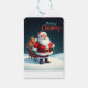 En vismisk vinterscen med Jultomten, lastad med gåvor, i sitt slö mitt i ett snöslandskap. Texten "God jul" visas elegant i festive färg, vilket ökar julhelgens glädjande atmosfär.