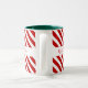 Den här personligen är ett vackert jultema i mugg och med rött och vitt diagonalt rand som bakgrund. "God jul" skrivs på ena sidan med ett böjligt rött teckensnitt och ditt namn skrivs på den andra sidan med samma formaterade teckensnitt. Insidan av mugg. Anpassa mugg på olika sätt. Rand: Design by Huckleberry Hearts, LLC, © www.Huckleberry-Hearts.com