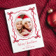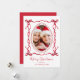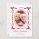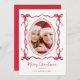 Modern julhelg-kort med ditt foto som visas i en handmålad röd prickad oval ram och en vit vågigt ram gräns som består av rött rosett band och krukor, "God jul" i ett lekfullt rött skript och din familj namn i en röd skrift.