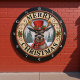 Detta är ett festligt och charmerande cirkeltecken som visar en renare i en snöig, trädbevuxen miljö. Renarna bär ett rött top hat, försett med hullbär och en röd och svart slafsa. Bakgrunden visar en fredlig vinterscen med träd som är täckt av snö. Bilden är uppbyggd av ett rostfritt, trätexturerat gräns med ornerade blommönster och ord "GOD JUL" skriven i fetstilt, böjt brev. Hela designen har en varm, vintage helgdag.