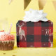 God jul text i en land-lina med stor hjort på röd och svart buffelbaksida.