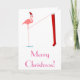 Önskemål "god jul för denna fånigjulkort!", till det mottagareare och särdrag den rosa silhouetten av en flamingo med mycket långt ben och röd en Santa hatt som hänger upp en mycket lång röd julstrumpa.