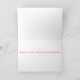 Detta dumma julkort önskar mottagaren "God Jul!" och har silhuetten av en rosa flamingo med långa ben och en röd tomtehatt som hänger upp röda, gröna och blå julstrumpor ovanför ett dekorerat julgran.