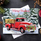 Fira säsongen med det här nostalgiska God jul-kortet med en vintage röd lastbil, försedd med festliga dekorationer och snögrindar. Den här lysande illustrationen framkallar varningen av en klassisk jul och är perfekt för att skicka helgdag till nära och kära. Perfekt för dem som uppskattar rustiska, vintage-inspirerade helgdag.