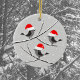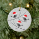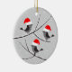 Denna söta julkeramiska prydnadsföremål illustrerar tre fåglar sitta på träd grenar som täcks av snö. Fåglarna bäror tomten och njuter av ett mjukt snöfall. Man illustrerar med begränsade grått-toner för att betona glädjen hos det ljusa röda färg i hattarna. Baksidan av prydnaden har den röda texten "God jul!" Brev täcks också något av snö. Underbar dekoration och gåva till vänner och familj.