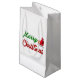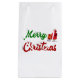 Gift-säckar med God jul i 3D-grönt och röd text med Jultomten-sleigh. Mjuksäck finns i många storlekar.