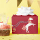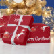 Modern julklapp, för barn, med en enhörning som drar tomtens själ. hälsning ’God jul’ i snyggt typografi. och en personlig namn. På Julafton röd bakgrund.