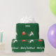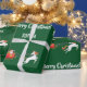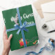 Den moderna julklappen i för barn, med en enhörning (med mane och saga med rött och guldfärgat glitter) som drar tomtarts sleigh, hälsning "God jul" i snyggt typografi och personlig namn. På grönten Julafton.